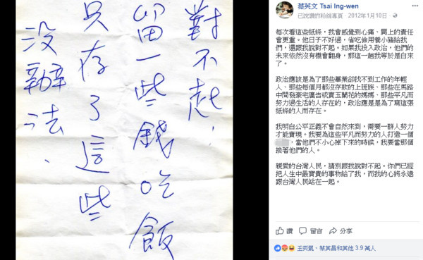 有網友翻出蔡英文于2013年2月6日的臉譜網(Facebook)貼文,該篇充滿感性的文章如今被稱為“諷刺無比”。據臺灣《中時電子報》報道,蔡英文該篇貼文中寫道:“一群求助無門的關廠失業勞工無助的躺在冰冷的鐵軌上……而是月臺上準備排除他們的警察……原來應該照顧勞工的‘政府’,現在卻成為勞工們痛苦和恐懼的來源。”“月臺上下看來兩個世界,但每一位不都是我們的家人、我們的同胞?每一位不都值得擁有一個溫馨而沒有擔憂恐懼的新年?!”“一旦我們漠視了,這樣的事情就會一再發生,而受害者有可能就是我們自己。”