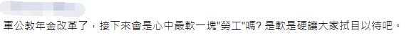 在民進黨人數優勢下,經過12小時以上的逐條表決、發言,島內軍人年金改革方案昨日深夜11時19分三讀通過。按照臺當局規劃,過不了幾天,也就是7月1日,軍公教(軍人、公務員、教師)年金改革將同時上路。
