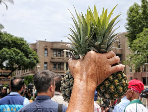 有農(nóng)民高舉鳳梨抗議,控訴臺(tái)當(dāng)局產(chǎn)銷管控不彰。(圖片來(lái)源:臺(tái)灣《聯(lián)合報(bào)》)