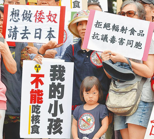 臺灣民眾抗議開放核災食品輸臺。圖為母親帶孩子參加抗議。(圖片來源:臺灣《中時電子報》)