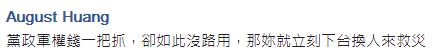 臺名嘴也氣爆了。資深氣象主播李富城在Facebook表示,真好玩,所有的資源都在你蔡大小姐手中,國民黨已被你抄家滅族啦,沒有資源拿什么救災,再說,救災不就是你執政黨的事嗎?如果覺得救災無能的話,就盡快讓出來,讓有能力的人來做,不要占著茅坑不拉屎。
