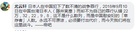 有網友留言向日本喊話:你們對慰安婦還沒正式道歉跟補償。中國人民不介意讓這件事成為國際對日本慰安婦的撻伐先鋒!
