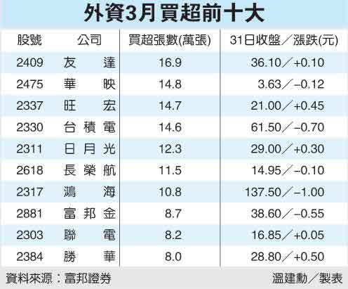 外資3月前十名的買超標的集中面板、半導體,其中以友達買超16.9萬張居冠。摩根士丹利科技產業分析師王安亞,高喊友達董監改選行情啟動。友達融券余額已從1月下旬高峰的2.3萬多張,降到昨天的6800多張。王安亞認為,友達在2001年、2004年、2007年分別改選董監,當年股價都有20%至50%的漲幅,今年友達的改選行情同樣值得期待;此番論點吸引外資買盤先行卡位。