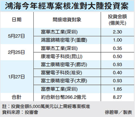 鴻海今年仍不斷投資大陸,由臺當局“投審會”項目審查核準的案子已有八件,累計金額8.27億美元,約新臺幣266億元。“投審會”執行秘書范良棟指出,鴻海在大陸據點超過100個,增資資金來源來自盈余,大陸事業獲利后,一部分匯回臺灣,一部分再投資。