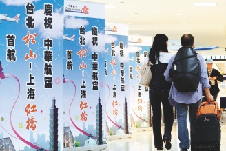 松山機場昨天上午首航上海虹橋機場,旅客往來雙城更便利,搶到頭香機的華航也在機場宣傳慶祝。來源:臺灣《聯合報》