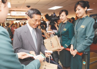 臺北松山機場昨天上午首航上海虹橋機場,由華航搶得頭香,臺北市長郝龍斌(左)與華航董事長魏幸雄(右)搭乘首航機,見證兩岸直航新的里程碑。來源:臺灣《聯合報》