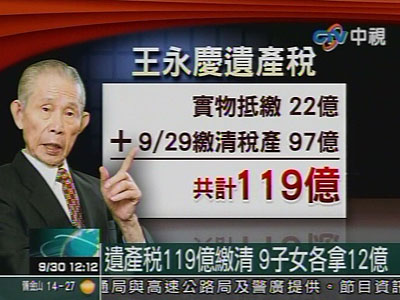 王永慶2008年10月突然過世,據指出,王永慶在島內共留下595億元的遺產,共需繳交119億元的遺產稅,其中,在去年9月有113億元入帳,使得9月份的遺產稅實征凈額達133億元,創下的史上單月新高紀錄。另外6億元的實物抵繳部分,也在11月由臺當局“財政部國有財產局”完成土地變更為公有。119億元的遺產稅悉數上繳,如果再加上28億元的贈與稅,合計王家去年共繳交了147億元的遺贈稅。(中國臺灣網 馮江)