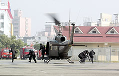 “2007金華演習實兵演練”6日在高雄市舉行,假設2009年世運期間高鐵左營站遭恐怖攻擊,展現軍警對世運維安的應變能力。圖為模擬處理左營車站爆裂物。 來源:“中央社”
