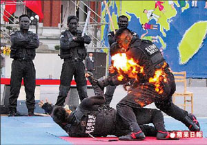 以往神秘的憲兵特勤隊,近年為爭取預算頻頻曝光,還要表演碎大石等“雜技” 。來源:臺灣《蘋果日報》