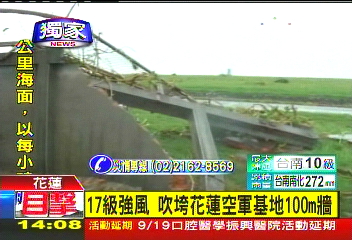 中國臺灣網9月19日消息 據臺灣TVBS電視臺報道,“凡亞比”臺風上午從花蓮登陸,在花蓮市區吹起17級的強陣風。100米的臺軍空軍基地圍墻“應風而倒”,像紙片一樣散落一地。