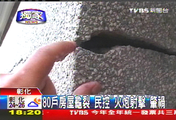 彰化縣大莊村民表示,火炮射擊威力巨大,伴隨劇烈震動,不僅震落了房屋磁磚,房屋的天花板、客廳地板、外墻均布滿大大小小的龜裂痕跡。一位村民表示,他的2層小樓整個都被震裂,裂縫非常大,如果有地震發(fā)生,一定會被嚇?biāo)溃桓以僮 ?/P>