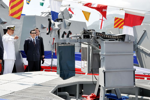 臺海軍7日在蘇澳軍港舉行換裝“光華6號”導彈快艇成軍典禮,馬英九(左2)前往發(fā)布“成軍令”,并在軍方解說下,了解艦上T75型20毫米機炮性能。 圖片來源:“中央社”