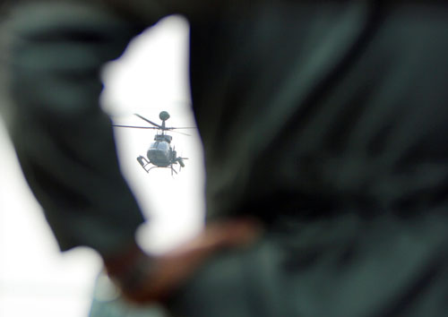 臺軍12日舉行中山高速公路麻豆段戰備跑道操演。圖為OH-58D直升機執行戰搜演練。 圖片來源:“中央社”