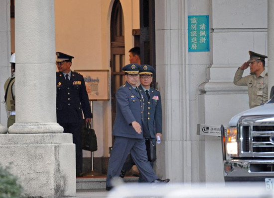 阿帕契案重創(chuàng)臺(tái)軍形象,臺(tái)防務(wù)部門與臺(tái)軍高階將領(lǐng)8日向馬英九報(bào)告軍紀(jì)安全檢討。圖為臺(tái)軍高階將領(lǐng)會(huì)后離開馬英九辦公室。圖自臺(tái)灣“中央社”