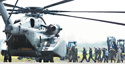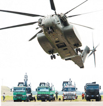 美方馳援臺灣“88水災”的MH-53E型“種馬”直升機昨天飛抵臺軍的臺南軍用機場。圖片來源:臺灣《聯合報》
