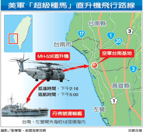美軍第一架MH-53E直升機昨天下午飛抵臺軍的臺南軍用機場,一個美方協調小組隨機抵達,進行先期救災協調工作,預定今天正式展開行動。AIT新聞科長萬德福指出,因考慮后勤、維修等因素,美軍直升機在臺灣內部執行救援任務后都將飛返“丹佛號”,不停留過夜。