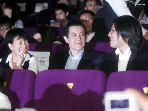 馬英九(中)28日與龍應臺(左)、導演張榮吉(右)一起觀看影片《逆光飛翔》。(圖片來自臺媒)