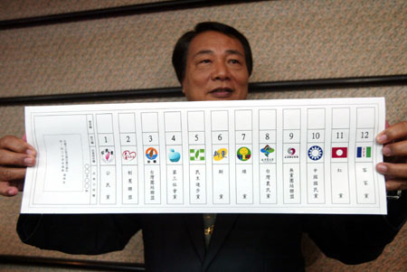 臺(tái)“中選會(huì)”去年12月21日公布有史以來(lái)首張彩色選票樣張,上面印有十二個(gè)參選不分區(qū)“立委”的政黨名稱(chēng)及其政黨標(biāo)章。