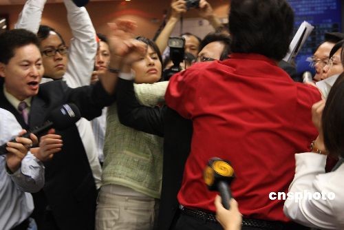 國民黨“立委”李慶華在臺當(dāng)局“立法院”進(jìn)行程序發(fā)言時,民進(jìn)黨“立委”邱議瑩在臺下表達(dá)不滿意見,引發(fā)李慶華不滿,要邱議瑩“有點(diǎn)家教”,邱議瑩(左四穿白衣女性)與李慶華(穿紅衣男性)爆發(fā)口角,并突然從后面打李慶華一巴掌。 中新社發(fā) 耿軍 攝