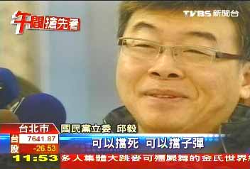 據(jù)臺(tái)灣TVBS電視臺(tái)報(bào)道,邱毅說(shuō)臺(tái)灣歌手潘美辰的歌曲《我可以為你擋死》是他最近的心情寫照:“可以擋死、可以擋子彈,心情不好,就聽(tīng)聽(tīng)潘美辰的這首歌,聊以自慰。