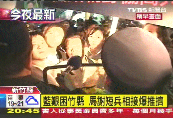 據(jù)臺(tái)灣TVBS電視臺(tái)報(bào)道,馬英九、謝長(zhǎng)廷,各自帶著候選人掃街,沒想到半路上,狹路相逢,爆發(fā)沖突。綠營(yíng)支持者不滿員警為了元首維安,在馬路上拿盾牌筑人墻,不讓拜票隊(duì)伍經(jīng)過,情緒爆發(fā)。他們對(duì)著馬英九高喊:“為什么不能過去?為什么不能過?”混亂中還有人動(dòng)手拉扯候選人旗幟,場(chǎng)面更加混亂。