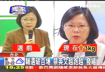 蔡英文本來就不是瘦尖臉形,現在看起來,雙頰下巴更成了一道圓弧線,體重增加3公斤,賣力抬轎輔選,怎么會越抬,自己越福態?蔡英文稱,“因為行程比較緊湊,吃的地方都不定時,也不知道在哪里,所以每一頓都要吃得很飽。”