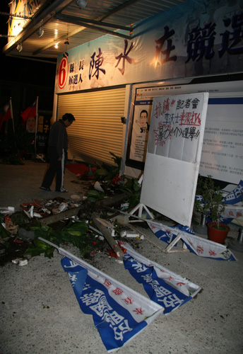 金門縣長候選人陳水在競選總部,29日深夜遭另一位縣長候選人許敬民駕駛宣傳車沖撞,現場一片狼籍,幸無人受傷。許敬民被警方逮捕漏夜偵訊。 臺灣“中央社”圖