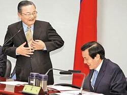 昔日最佳戰友及伙伴再度歸隊,馬英九的好心情全寫在臉上,掩不住笑意。在常會進行過程,馬亦頻頻與坐在右手邊的金溥聰低語,交換意見。