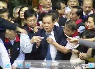 民進(jìn)黨“立委”18日采取激烈抗?fàn)帲踔烈欢榷伦¢T不讓“立法院長(zhǎng)”王金平主持議事,最后國(guó)民黨“立委”出面護(hù)衛(wèi),包括到主席臺(tái)將“立法院副院長(zhǎng)”曾永權(quán)團(tuán)團(tuán)圍住,阻擋民進(jìn)黨團(tuán)干事長(zhǎng)李俊毅爬上主席臺(tái)。主席臺(tái)的麥克風(fēng)被民進(jìn)黨“立委”扯掉,國(guó)民黨“立委”則立刻拿出手持式麥克風(fēng)進(jìn)行表決。