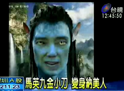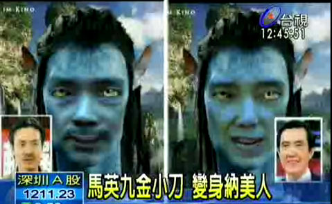 據臺灣今日新聞報道,電影《阿凡達》里面,因家園被美國人入侵群起反抗的納美人,這個意涵最近被網友運用在即將因為美國牛與美國談判的臺當局高層上,網友把馬英九、金溥聰分別與納美人做合成照,有網友說,納美人是藍色的,馬英九正好是藍營高層,剛好。