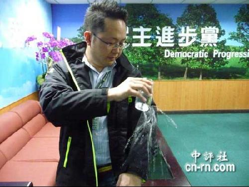 文宣部副主任李厚慶示范防水效果。(中評社 鄒麗泳攝)