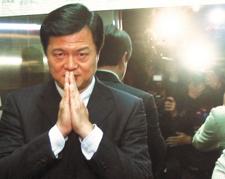臺北縣長周錫瑋宣布退出新北市選戰后,臉色疑重、雙手合十表達謝意。圖片來源:聯合報