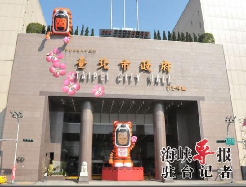 新春時期的臺北市政府大樓正門,擺上;ⅲê{導報駐臺記者 陳柱勝 攝)