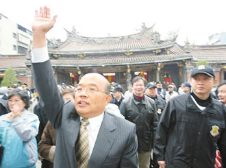 蘇貞昌和保安宮結緣深,2008年“大選”時,身為臺灣地區(qū)副領導人參選人,曾到保安宮祈福。今天將在此宣布參選臺北市長,在神明前許諾,不是選假的。圖片來源:臺灣《聯(lián)合報》