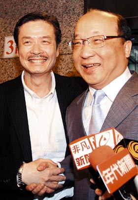臺(tái)中市長(zhǎng)胡志強(qiáng)(右)昨天前往國(guó)民黨中央黨部拜訪(fǎng)秘書(shū)長(zhǎng)金溥聰(左),表達(dá)參選大臺(tái)中市長(zhǎng)是他最?lèi)?ài)的選擇,也是唯一的志愿。來(lái)源:臺(tái)灣《聯(lián)合報(bào)》