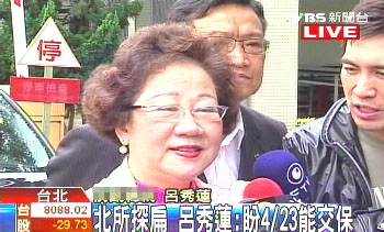在民代及陳水扁親信陪同下,呂秀蓮座車直接開進臺北看守所會客,與陳水扁會面近半小時。呂秀蓮轉述,陳水扁希望法官秉持公平正義原則,讓他能在審判前交保候傳。(中國臺灣網 陳佳慧)