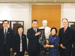 福建省長黃小晶(中)5日抵臺,首站拜會“同鄉”辜嚴倬云女士(右2)。圖為雙方互贈禮物留影。圖片來源:臺灣《中國時報》