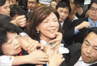 民進黨“立法院”黨團占據主席臺阻撓會議進行,民進黨籍民代用手捂著會議主席趙麗云(中)的嘴。圖片來源:臺灣《聯合報》