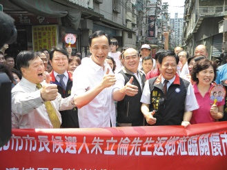 臺當局前“行政院副院長”朱立倫(前排左二)投入新北市長選舉,昨天到中和市與鄉親博感情,受到當地民眾熱烈歡迎。圖片來源:臺灣《聯合報》