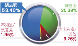 在臺(tái)灣《蘋果日?qǐng)?bào)》舉辦的民調(diào)中,53.4%的受訪者力挺胡志強(qiáng),35.39%的受訪民眾支持蘇嘉全,分別有9.26%和1.95%的受訪者表示未決定或無意見。(中國(guó)臺(tái)灣網(wǎng) 陳佳慧)