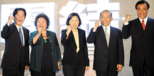 民進黨“五都”造勢活動昨日舉行,大臺中市長提名人蘇嘉全(右起)、臺北市長提名人蘇貞昌、新北市長提名人蔡英文、大高雄市長提名人陳菊、大臺南市長提名人賴清德。圖片來源:臺灣《聯(lián)合報》
