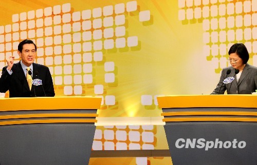 4月25日下午,備受臺灣輿論關注的“雙英”辯論會在臺北登場,馬英九(左)堅稱兩岸商簽ECFA必要而且緊迫,雙方攻防激烈。圖右為民進黨主席蔡英文。 中新社發 董會峰 攝