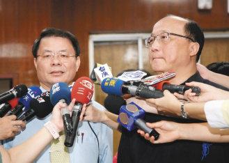 官警在槍擊現場,臺中市長胡志強(右)昨天上午表示,他第一時間不知情,并指警方報告疑點重重,他不愿為警方懲處背書;晚間,胡木源(左)去職后,胡志強重申“看完報告,局長不異動都難。”圖片來源:臺灣《聯合報》