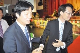 大臺(tái)南市長(zhǎng)參選人賴清德(左)和郭添財(cái)(右)昨天在臺(tái)南大學(xué)畢業(yè)典禮上“王見(jiàn)王”,相互握手致意。(圖片來(lái)源:臺(tái)灣《聯(lián)合報(bào)》)