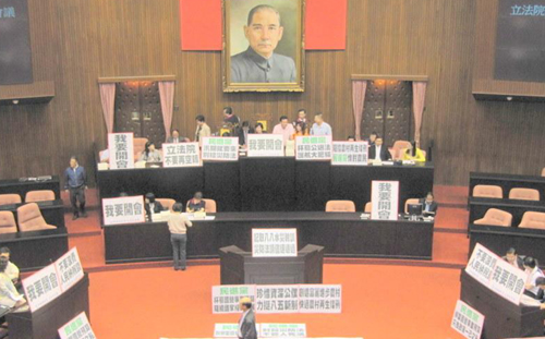國民黨籍“立委”一早進入“立法院”議場,占據主席臺、發言臺,并放置“我要開會”等抗議廣告牌,要求民進黨團不要再亂;民進黨團則在議場內研議議事攻防。