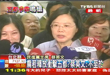 被問及如果明天(陳水扁)被釋放,是否會會沖擊選情。民進黨主席蔡英文說,“我覺得不至于啦,因為,經(jīng)過這兩年來的沉淀,還有很多我們的思考,陳水扁的這個案子,現(xiàn)在大家思考都比較成熟,面對這個問題也都比較沉穩(wěn),我不認為這個問題在我們五都選戰(zhàn)里面,會有什么很大的沖擊。”