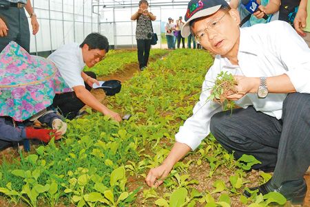 表態(tài)參選后的楊秋興希望綠營大老不要為難他,昨天他繼續(xù)走自己的路,參訪農(nóng)場時(shí)蹲下幫忙摘除雜草。圖片來源:臺(tái)灣中國時(shí)報(bào)