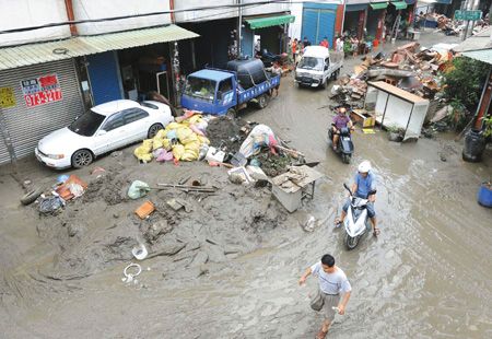 “凡亞比”臺風造成臺灣南部災情慘重,20日高雄縣仁武中華村積水退去,居民忙著清洗房子,街道上堆滿爛泥、垃圾。來源:臺灣《中國時報》