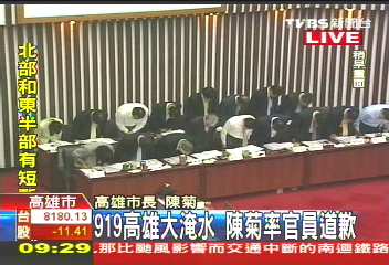據報道,高雄市議會今天的議程是高雄市政總質詢,高雄市議員黃淑美質詢陳菊對高雄市及市民飽受淹水之苦的感想。說到此, 高雄市長陳菊率領全體市府官員,向高雄市民鞠躬道歉。她表示,“深深一鞠躬,跟高雄市民,我們的鄉親道歉,非常抱歉,我們做得不夠好,我們必須更努力。”