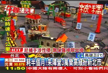 中國臺灣網10月28日消息 據臺灣TVBS電視臺報道,朱立倫陣營的青年軍花費長達15天的時間,用3萬片彩色樂高積木拼出3米高、4米寬的“繽紛新北市樂園”,將新北市的各大重要地標“一網打盡”。今(28)日,朱立倫象征性的拼上最后一塊,并表示非常歡迎民眾來競選總部玩樂高,一起體驗彩色新北市。
